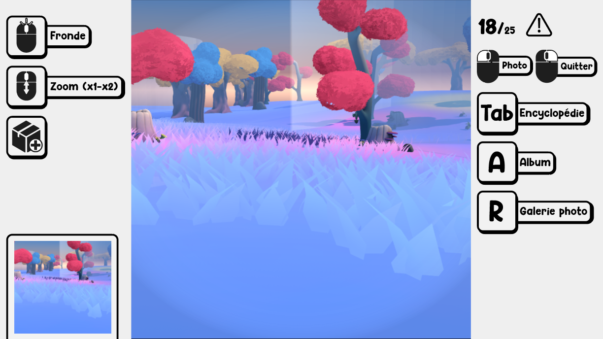 To proceed in step, our first goal was to make a fun toy to then later expend it to a full game experience of at least 30-45 min. Our toy is simple, you can walk around an environment populated by creatures, and take pictures of them if they are visible enough.